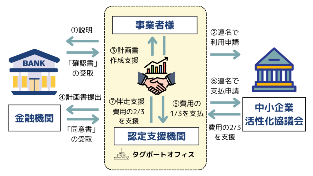 資金繰りや採算性の改善を必要とする事業者を対象に、認定経営革新等支援機関が経営改善計画の策定を支援し、計画を金融機関へ提出することで経営改善を促すもので、事業者が支払う計画策定支援に要する費用及び伴走支援費用について、国(中小企業活性化協議会)が3分の2(上限︎︎︎200万円)を負担します
